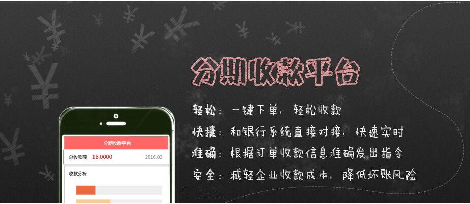 互联网分期收款平台,致力于压缩流通成本,提供互联网代收货款、代收租金、代收管理费、物业费等服务。