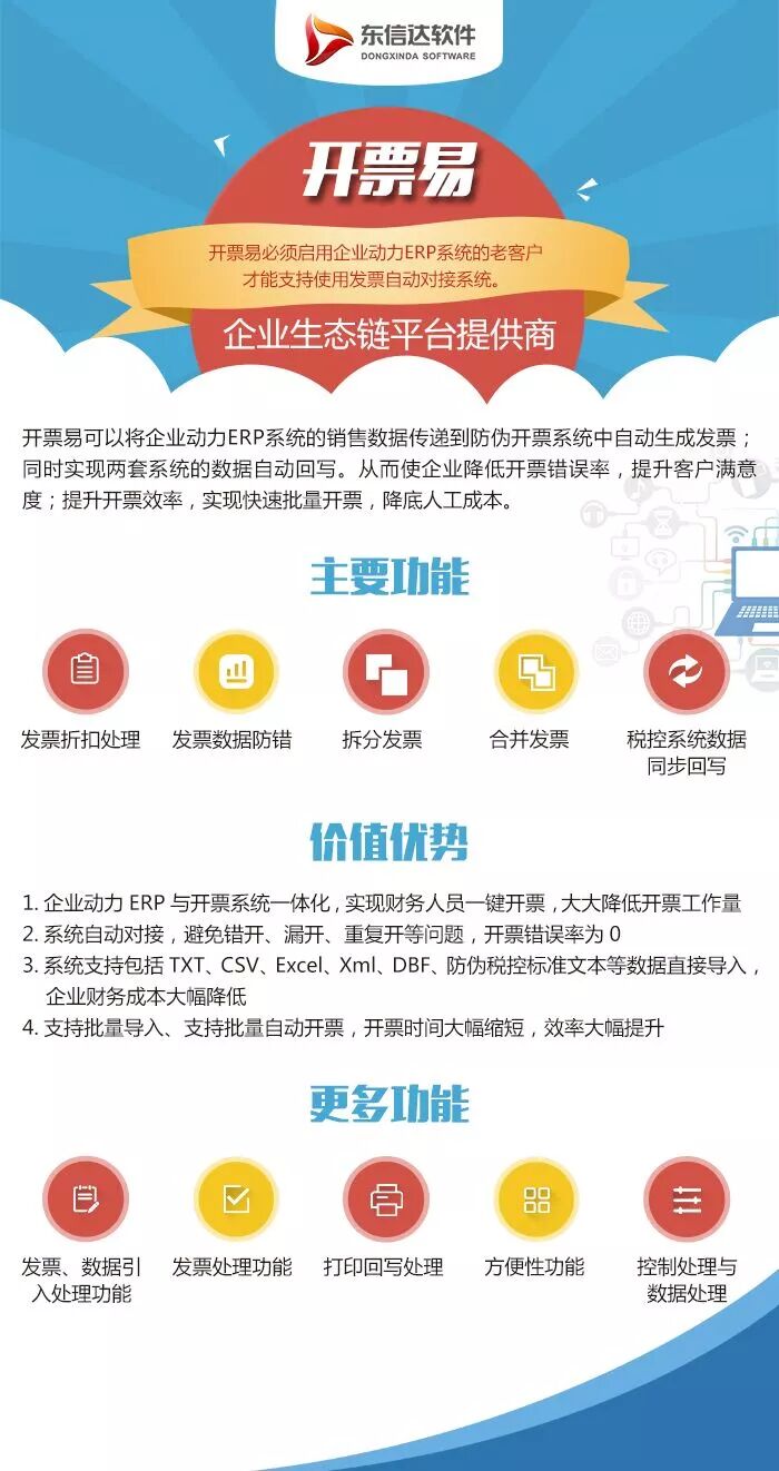 为提高企业的开票准确率及优化财务人员的开票流程,东信达公司推出开票易系统,把“企业动力”ERP直接对接销售发货、销售发票,通过与税控系统直接对接,实现“企业动力”ERP系统与开票系统无缝对接,从业务单据到销售开票的数据一体化、操作智能化。